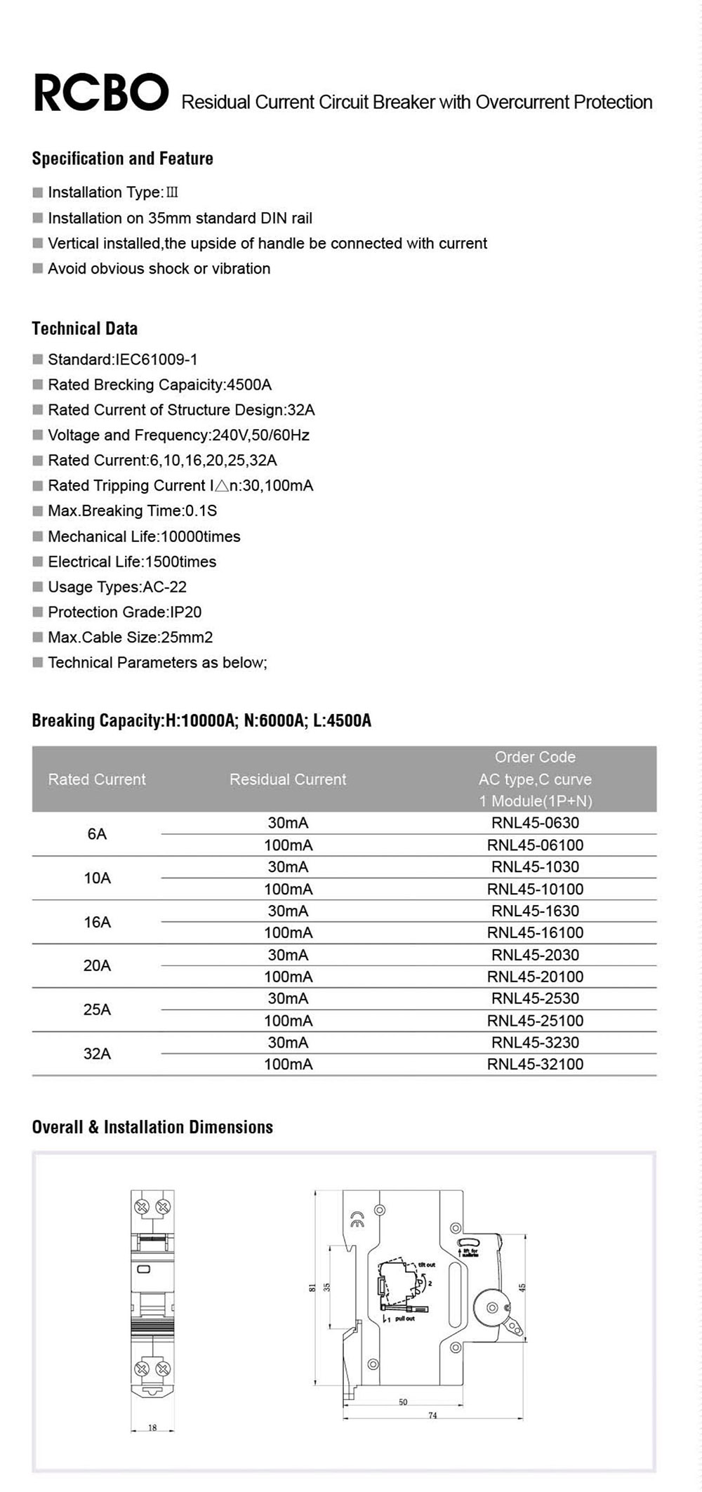 RCBO HRNL-32 Residual Current Circuit Breaker with Overcurrent Protection